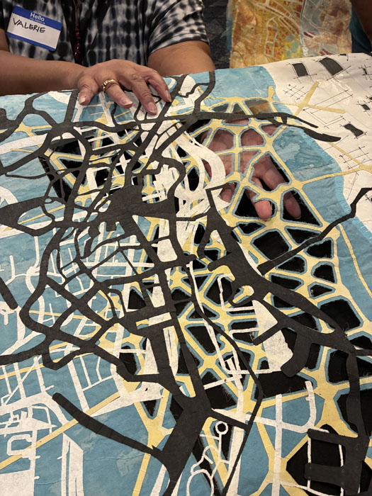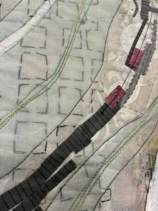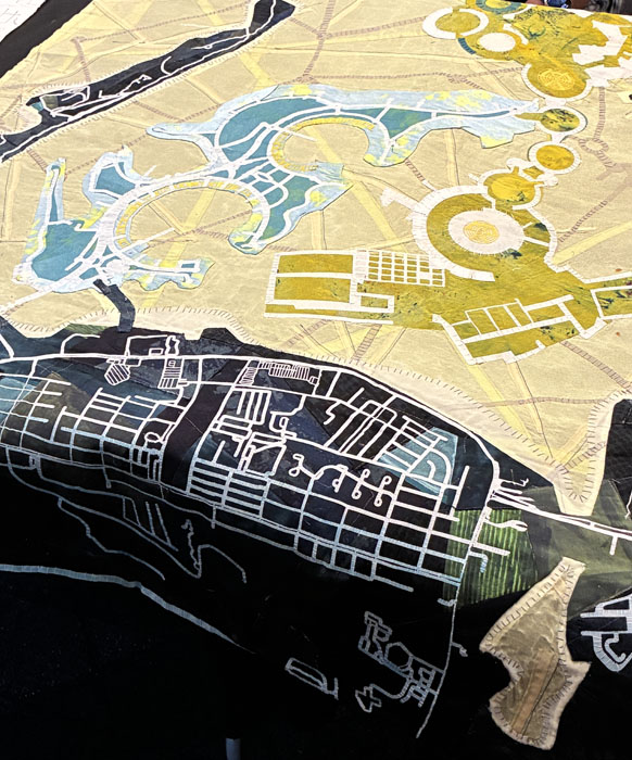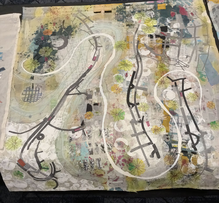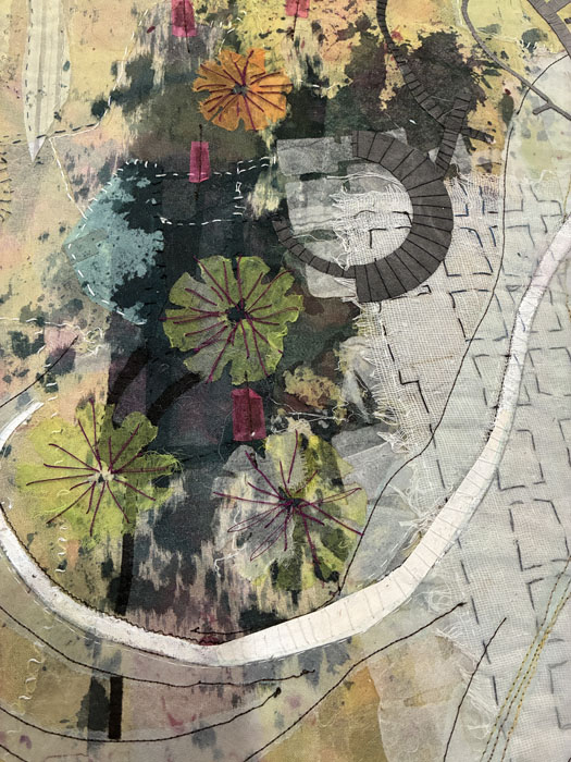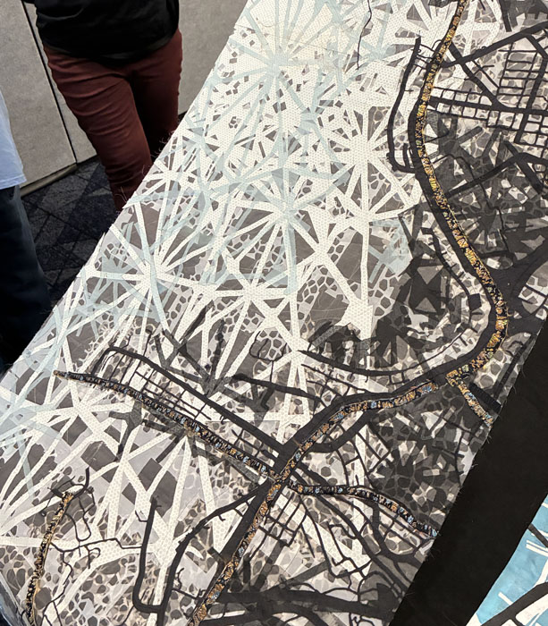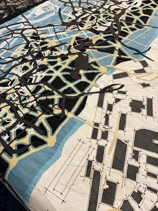 This piece was my favorite. As is typical with much of Valerie’s work, she has depicted a map here, maybe of a real place, or maybe of an imagined one. She seldom uses batting, so the pieces are lightweight and somewhat fragile and delicate looking.
