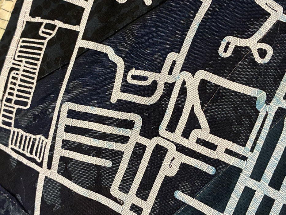 Another area of the same quilt. The black squarish building shapes are also holes. The quilt was lying on a black tablecloth, so it’s actually showing through.
